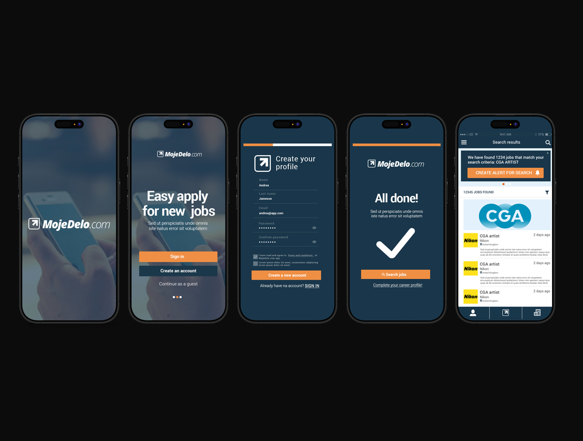 Moje Delo brought me in to design their mobile app from scratch—leading both UX and UI design, defining user flows, and delivering a clear, goal-driven experience for job seekers across Slovenia.